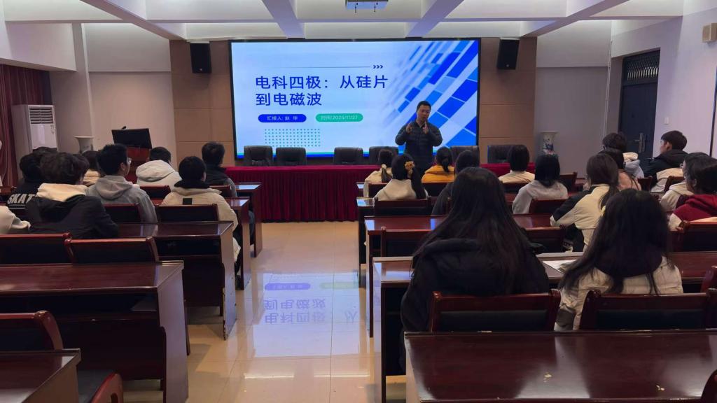 11月27日,女仆a片 在理科楼连廊402开展以“从硅片到电磁波”为主题的学术讲座。本次讲座邀请赵华老师主讲,2024级、2025级电子科学与技术专业全体学生参加。